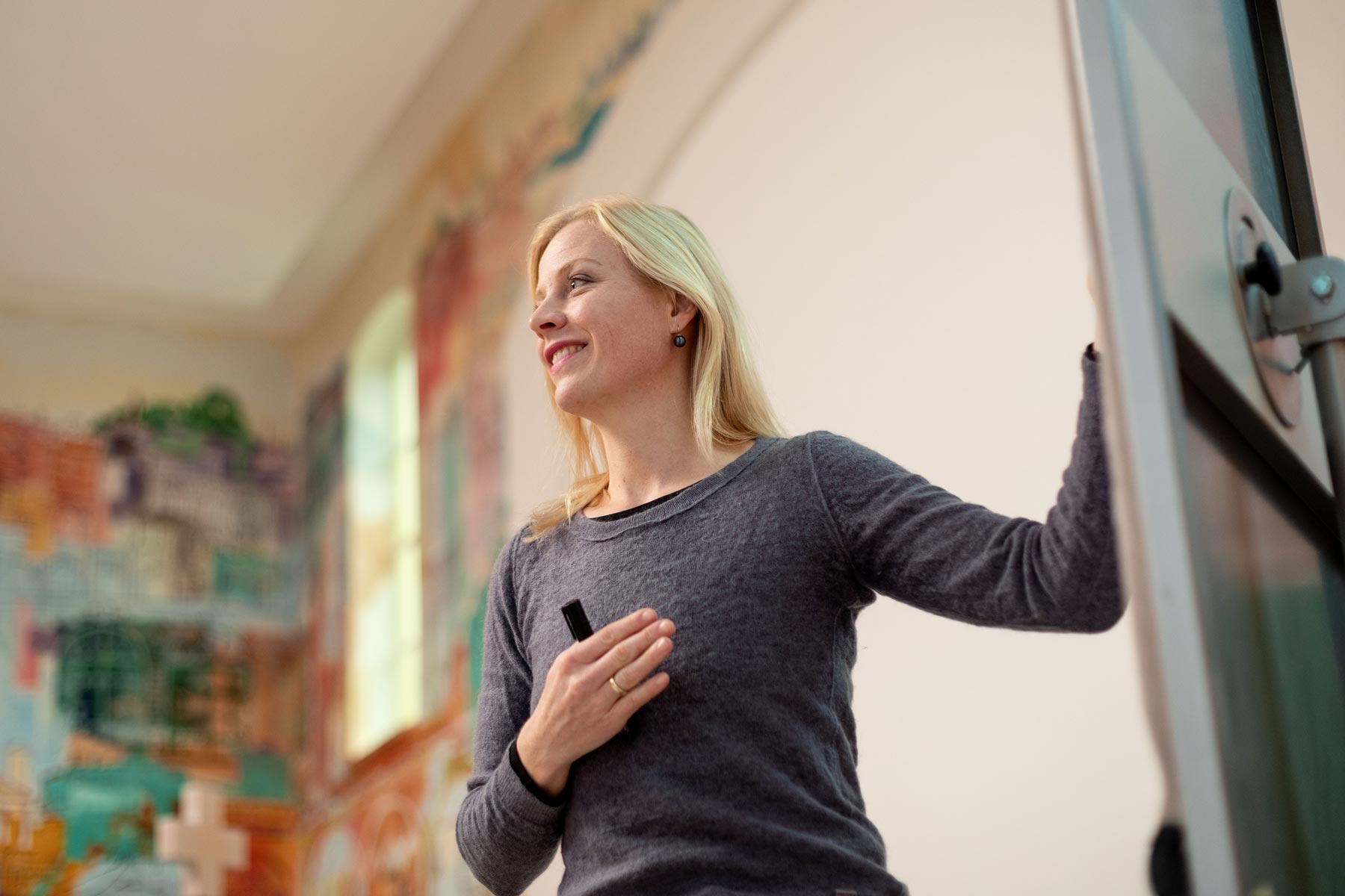 Als Feldforscherin für dialogischen Austausch untersucht und gestaltet Sibylle Reichel Kommunikation und Miteinander auf mehreren Ebenen: der Bildgestaltung, in Gesprächsprozessen, Visualisierung und improvisatorischer Bewegung. Ihre Wahrnehmungen in diesen Bereichen verwebt sie miteinander und lässt gerne durch Verknüpfungen Neues entstehen – wie zum Beispiel auf dieser Seite. In ihrer künstlerischen Arbeit hat Sibylle Reichel die Linografie entwickelt, eine Kombination aus Handdruck mit Linolstempeln und Zeichnung, die auch hier zum Einsatz kam.